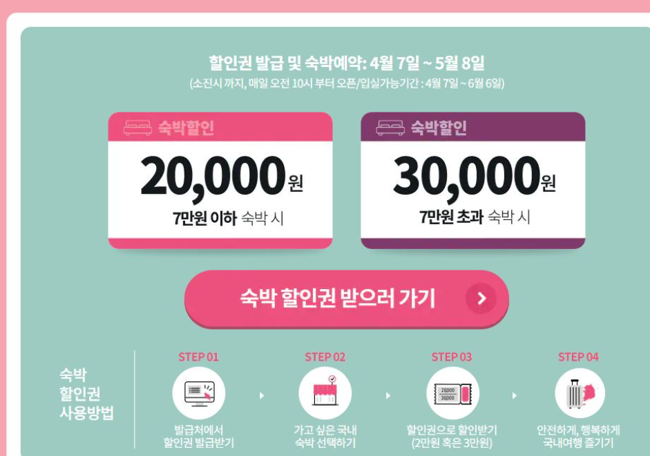 이러한 정부지원 숙박할인쿠폰을 발급 받기 위해서는 4월7일부터 5월 8일까지 할인쿠폰을 받아야 합니다.